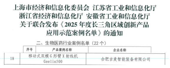 由长三角三省一市工信厅组织的2025年度长三角区域创新产品应用示范案例,共征集了涉及7个行业的976个案例。根据三省一市各行业专家联合评审,吉麦智能Geelin500系统CG双模G形臂凭借创新的伸缩臂结构、智能移动系统、CG两种使用模式和AI智能功能,在生物医药行业案例中脱颖而出入选该名单,我…......